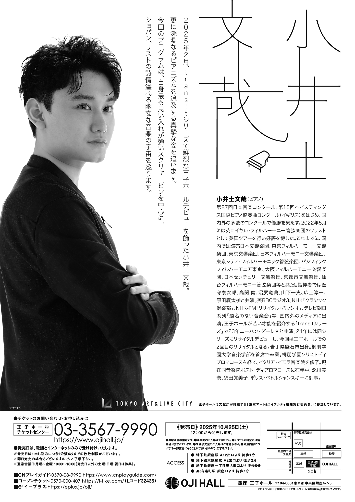 チケット購入 王子ホールチケットセンター ※オンライン予約で空席が無い場合は電話にてお問い合わせください。(チケットセンター 03-3567-9990)、CNプレイガイド、ローソンチケット、イープラス